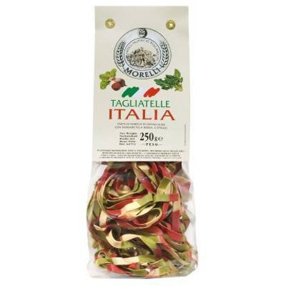 Morellis Pasta ist einzigartig, da sie handgefertigt ist. Anschließend wird sie 36 Stunden lang bei 45–50 Grad Celsius getrocknet. Diese Tagliatelle wird in den drei Farben der italienischen Flagge hergestellt: Weiß (klassische Pasta), Grün (Spinat) und Rot (Rote Bete). Eine wunderschöne Präsentation für Ihr italienisches Pastagericht.